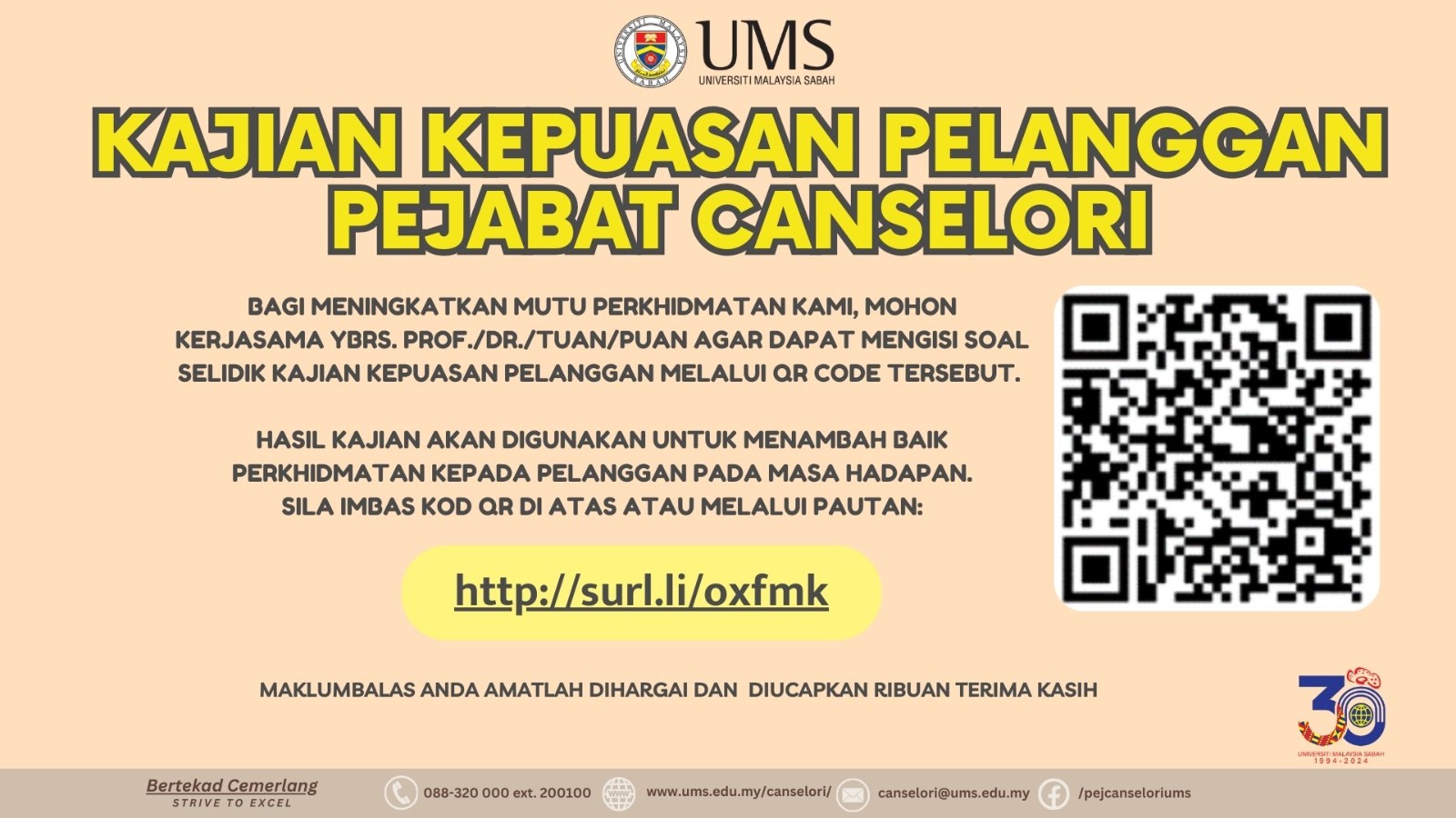 Bagi meningkatkan mutu perkhidmatan kami, mohon kerjasama YBrs. Prof./Dr./Tuan/Puan agar dapat mengisi soal selidik Kajian Kepuasan Pelanggan melalui QR Code tersebut. Maklumbalas anda amat kami hargai.