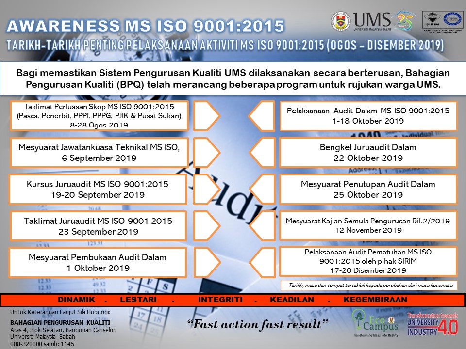 SUBJEK: TARIKH-TARIKH PENTING PELAKSANAAN AKTIVITI MS ISO 9001:2015 (OGOS - DISEMBER 2019)