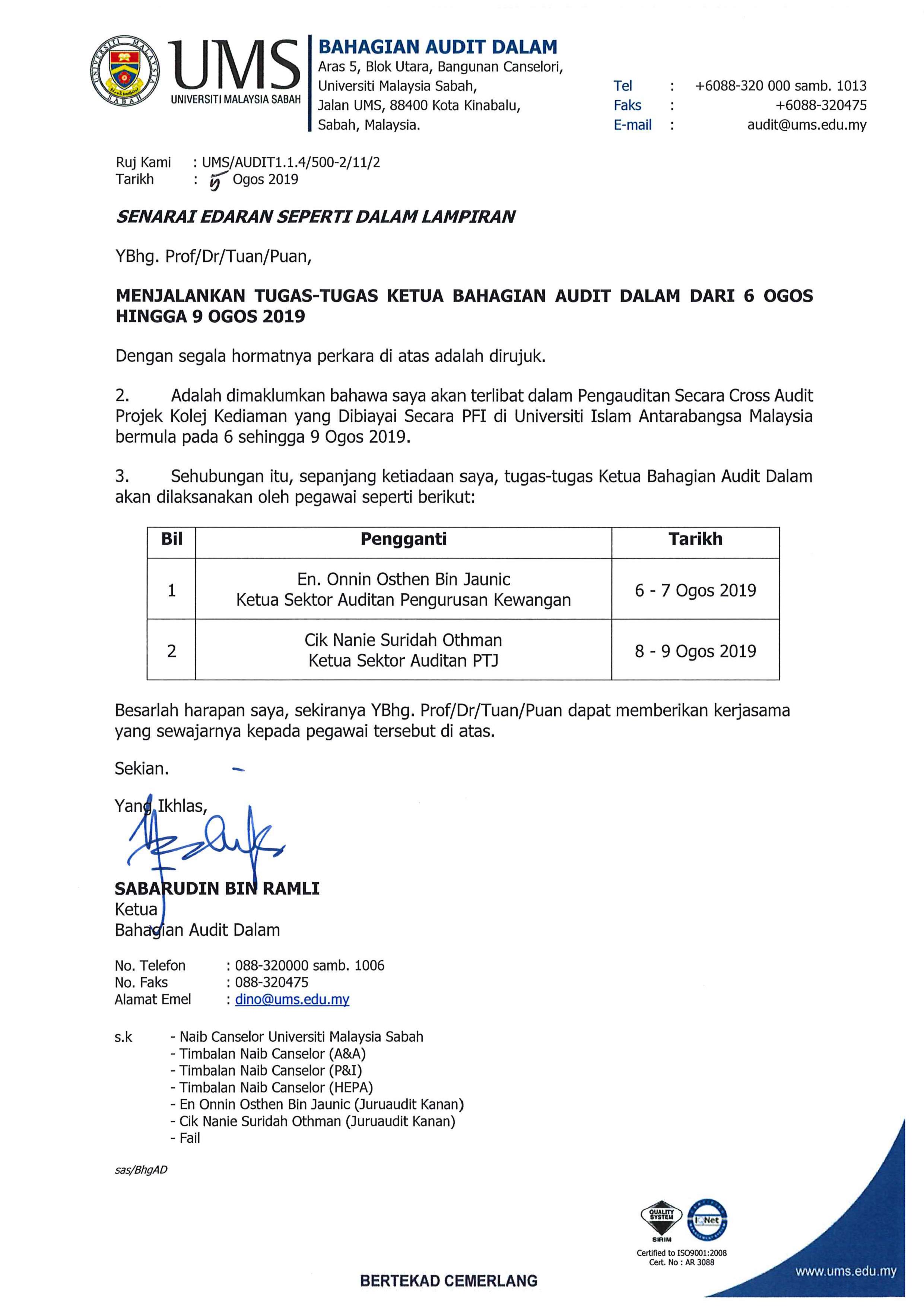 Subjek: Pengumuman Menjalankan Tugas Ketua Bahagian Audit Dalam