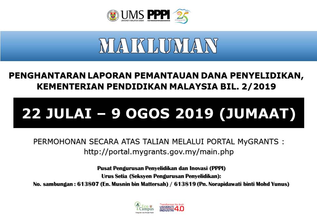 SUBJEK: MAKLUMAN PENGHANTARAN LAPORAN PEMANTAUAN DANA PENYELIDKAN, KEMENTERIAN PENDIDIKAN MALAYSIA BIL. 2/2019