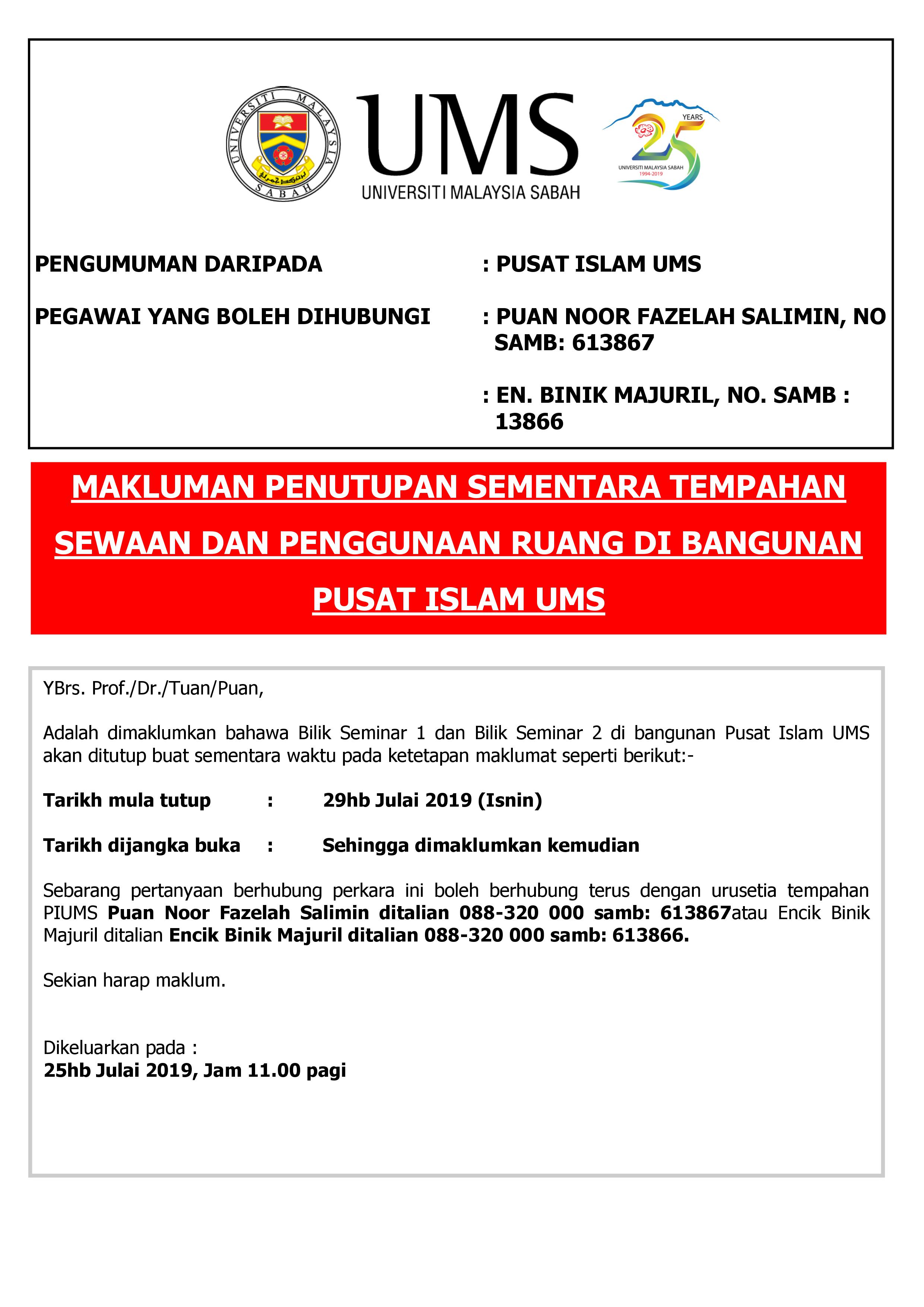 SUBJEK: MAKLUMAN PENUTUPAN SEMENTARA TEMPAHAN SEWAAN DAN PENGGUNAAN RUANG DI BANGUNAN PUSAT ISLAM UMS