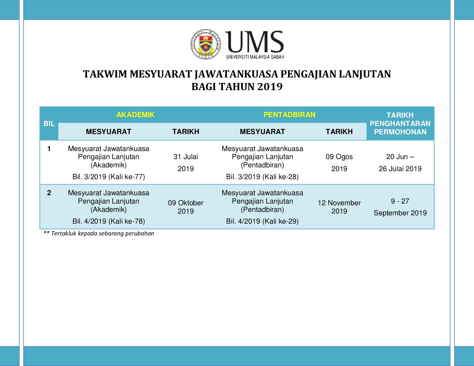 SUBJEK : TAKWIM TERKINI MESYUARAT JAWATANKUASA PENGAJIAN LANJUTAN TAHUN 2019