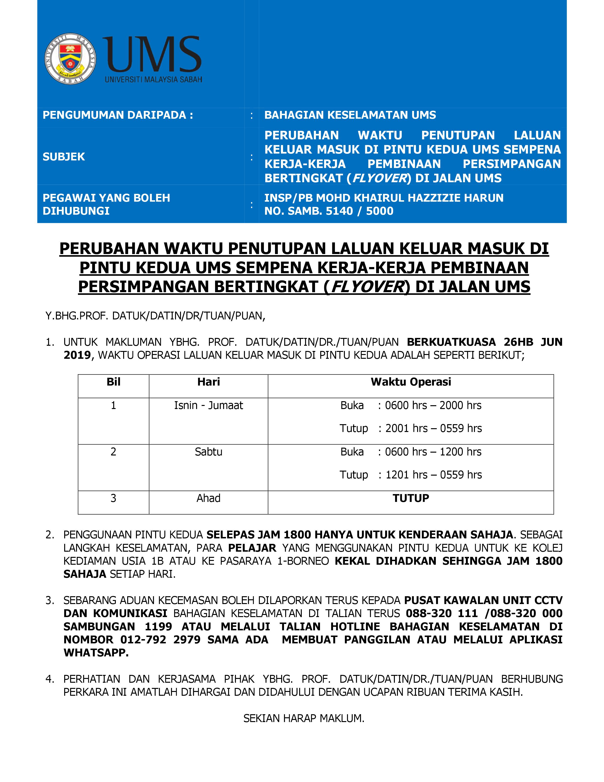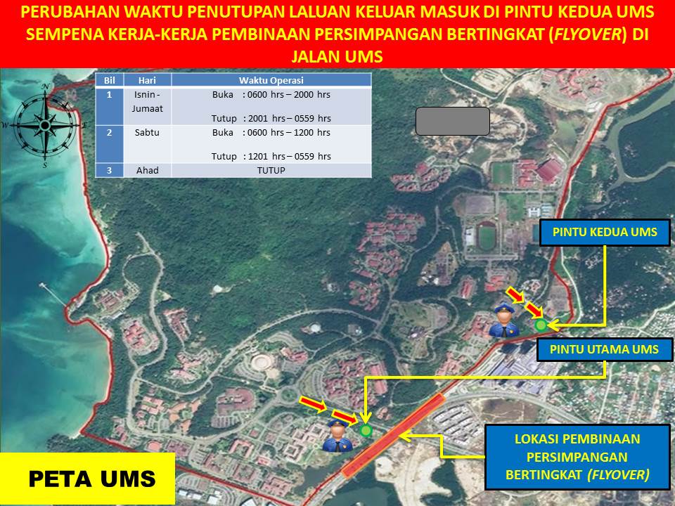 PERUBAHAN WAKTU PENUTUPAN LALUAN KELUAR MASUK DI PINTU KEDUA UMS SEMPENA KERJA-KERJA PEMBINAAN PERSIMPANGAN BERTINGKAT(FLYOVER) DI JALAN UMS