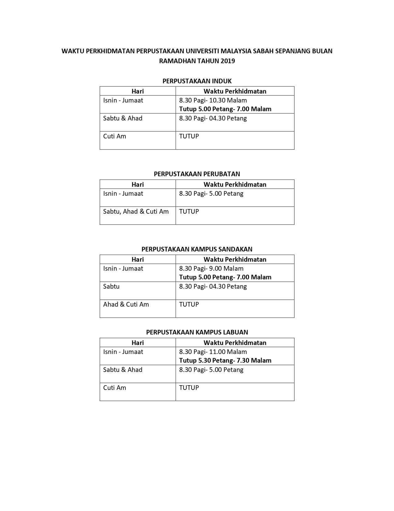 03 Mei 2019 Jumlah paparan: 2066 WAKTU PERKHIDMATAN PERPUSTAKAAN UMS SEPANJANG BULAN RAMADHAN TAHUN 2019 Cetak Emel PENGUMUMAN DARIPADA: PERPUSTAKAAN UMSSUBJEK: WAKTU PERKHIDMATAN PERPUSTAKAAN UMS SEPANJANG BULAN RAMADHAN TAHUN 2019