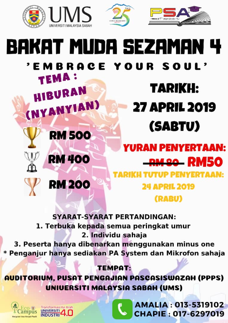 BAKAT MUDA SEZAMAN (BMS) kembali lagi untuk Siri ke 4 ? Anda seorang yang berbakat dalam bidang nyanyian, sedang mencari platform untuk menyerlahkan bakat. BAKAT MUDA SEZAMAN adalah pentasnya. Rebut hadiah yang menarik dan serlahkan bakat anda. Menampilkan barisan juri profesional. Dengan tema "Embrace Your Soul" anda SEMUA dialu-alukan untuk menyertai.