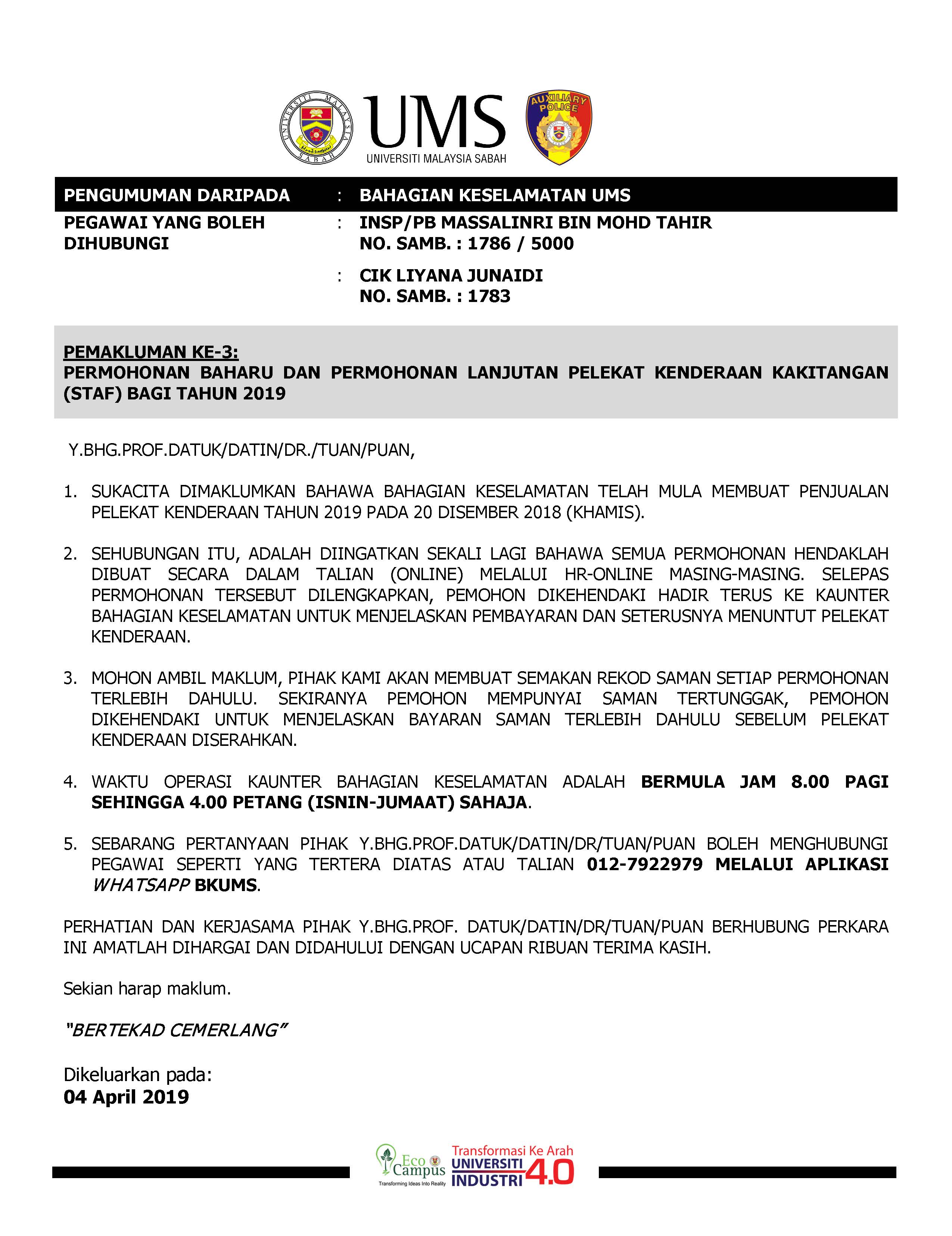 SUBJEK : PEMAKLUMAN KE-3 - PERMOHONAN BAHARU DAN PERMOHONAN LANJUTAN PELEKAT KENDERAAN STAFF
