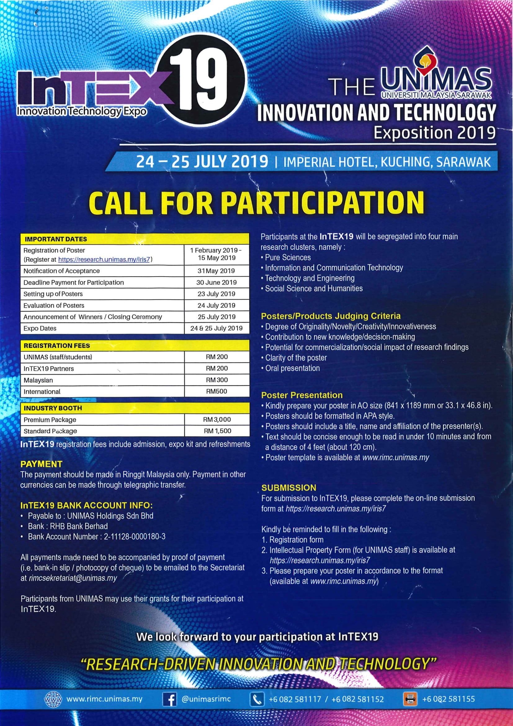 Dimaklumkan bahawa Universiti Malaysia Sarawak (UNIMAS) akan menganjurkan Innovation and Technology Expo 2019 (InTEX19) yang akan diadakan pada 24-25 Julai 2019, bertempat di Imperial Hotel, Kuching, Sarawak. InTEX19 adalah sebahagian daripada inisiatif penyelidikan dan inovasi UNIMAS dan berfungsi sebagai platform untuk para ahli akademik dan penyelidik UNIMAS mempamerkan hasil penyelidikan mereka. InTEX19 membolehkan para penyelidik mengetengahkan hasil penyelidikan mereka dan menterjemahkannya ke dalam hasil penyelidikan yang berinovatif dan kreatif.