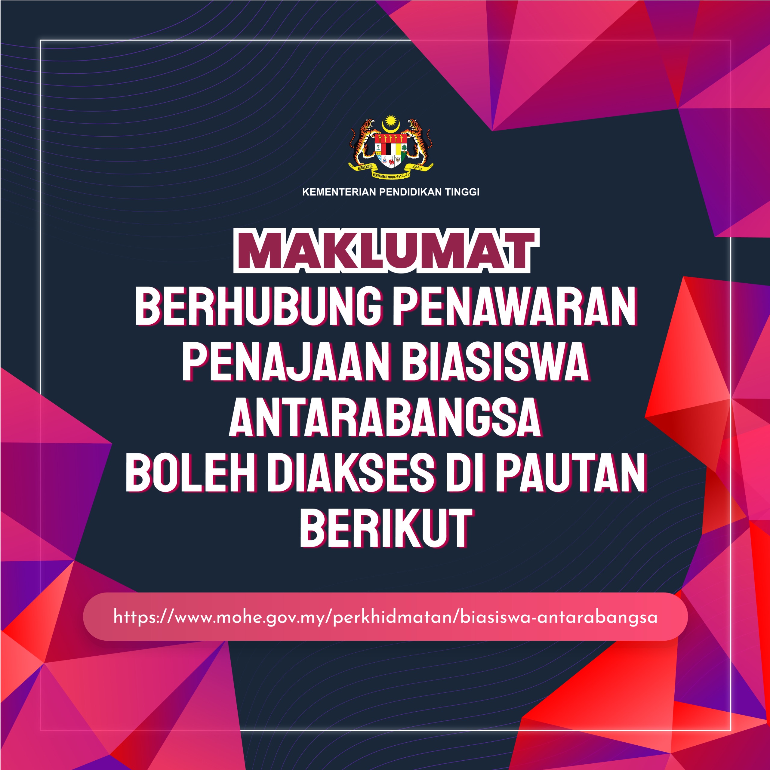 2. Sukacita dimaklumkan bahawa maklumat penawaran penajaan biasiswa antarabangsa kini boleh diakses di laman web rasmi Kementerian Pendidikan Tinggi di pautan berikut : https://www.mohe.gov.my/perkhidmatan/biasiswa-antarabangsa.