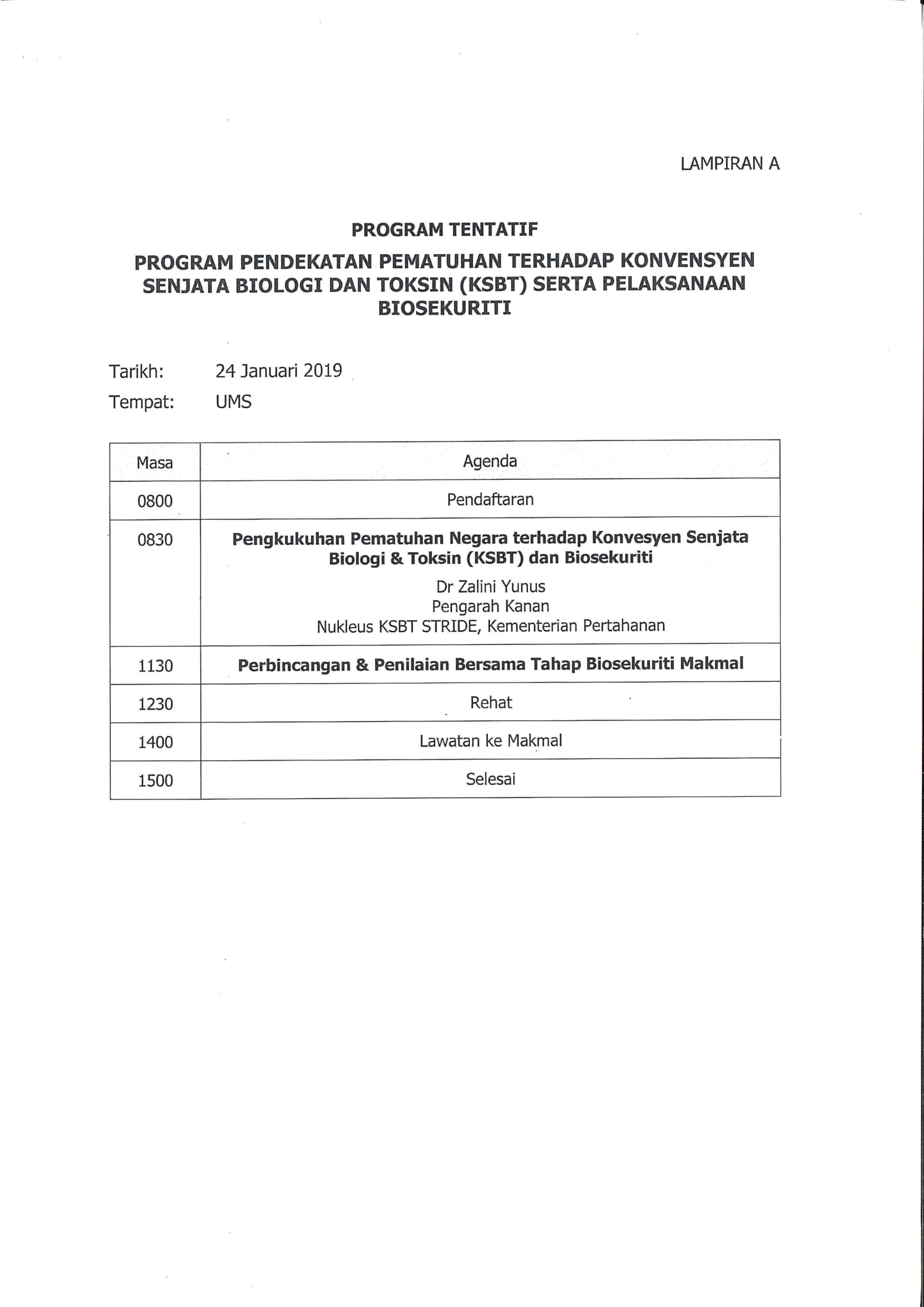 SUBJEK : PROGRAM PEMATUHAN TERHADAP KONVENSYEN SENJATA BIOLOGI DAN TOKSIN (KSBT) SERTA PELAKSANAAN BIOSEKURITI