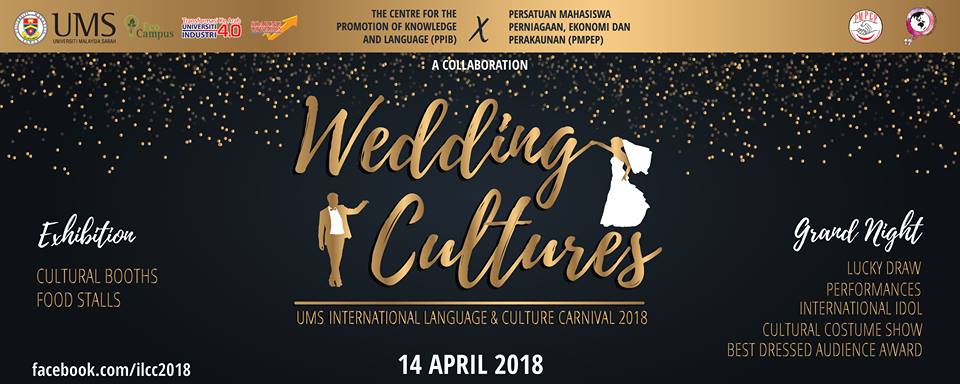 UMS ILCC 2018 akan diadakan pada 14.04.18 (Sabtu), di Dewan Resital bermula jam 9.00 pagi sehingga 10.00 malam. Antara aktiviti menarik ialah pameran Bahasa daripada 10 bahasa yang diajarkan di UMS (B. Inggeris, B. Melayu, B. Kadazandusun, B.Tamil, B.Mandarin, B.Korea, B.Jepun, B.Sepanyol, B. Perancis dan B.Arab) berdasarkan tema “Wedding Cultures”. Selain itu, terdapat juga gerai-gerai jualan makanan, minuman dan kraftangan.