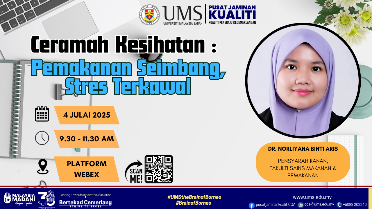 Sukacita dimaklumkan bahawa Pusat Jaminan Kualiti (CQA) akan menganjurkan program ceramah kesihatan seperti dinyatakan di atas yang akan diadakan mengikut ketetapan berikut: