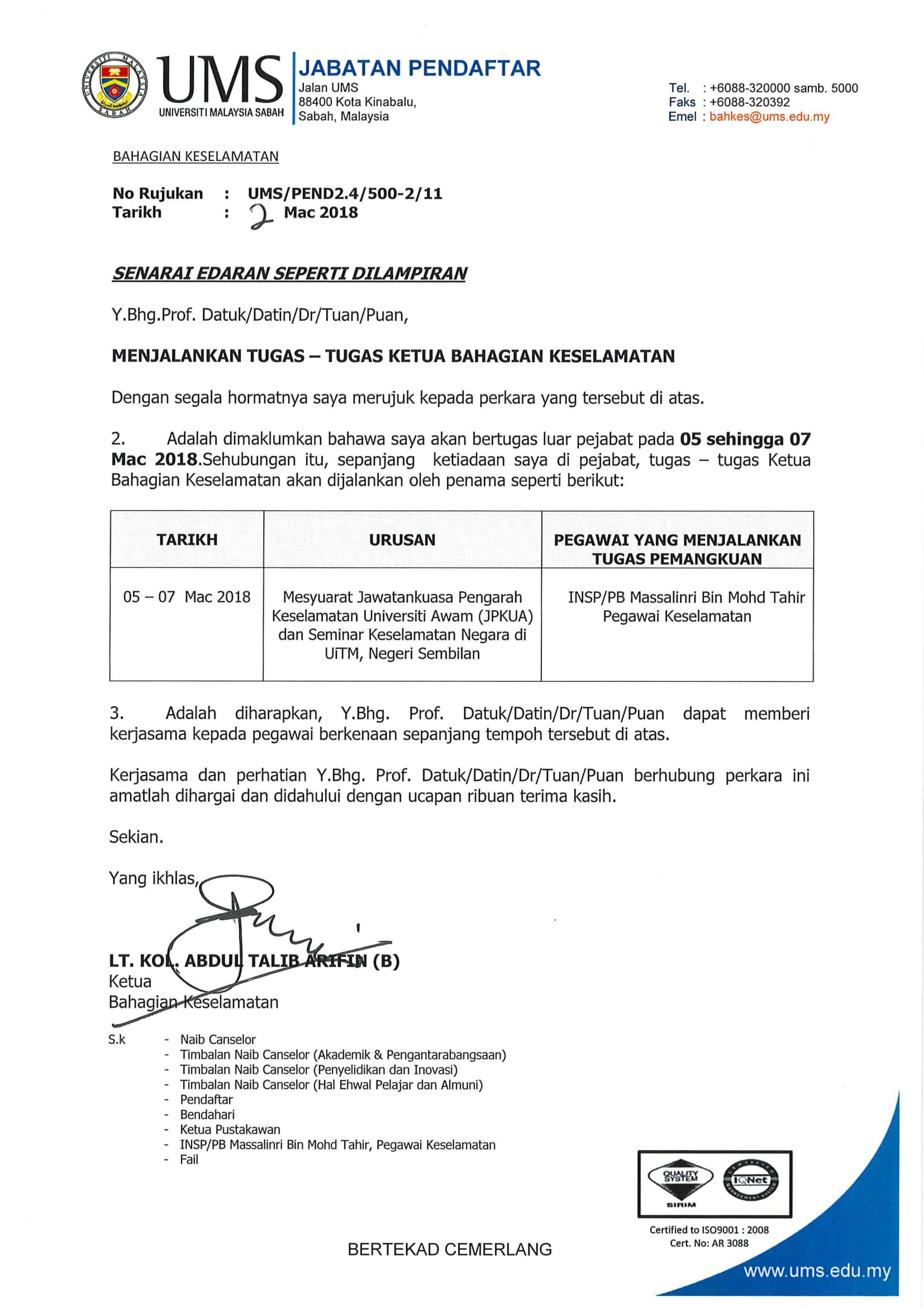 2. Seperti yang pihak YBhg. Prof./Dr./Tuan/Puan sedia maklum, Universiti Malaysia Sabah telah mendapat sijil pengiktirafan EKSA Kategori Cemerlang berkuat kuasa pada 01 Disember 2017 hingga 30 November 2019.