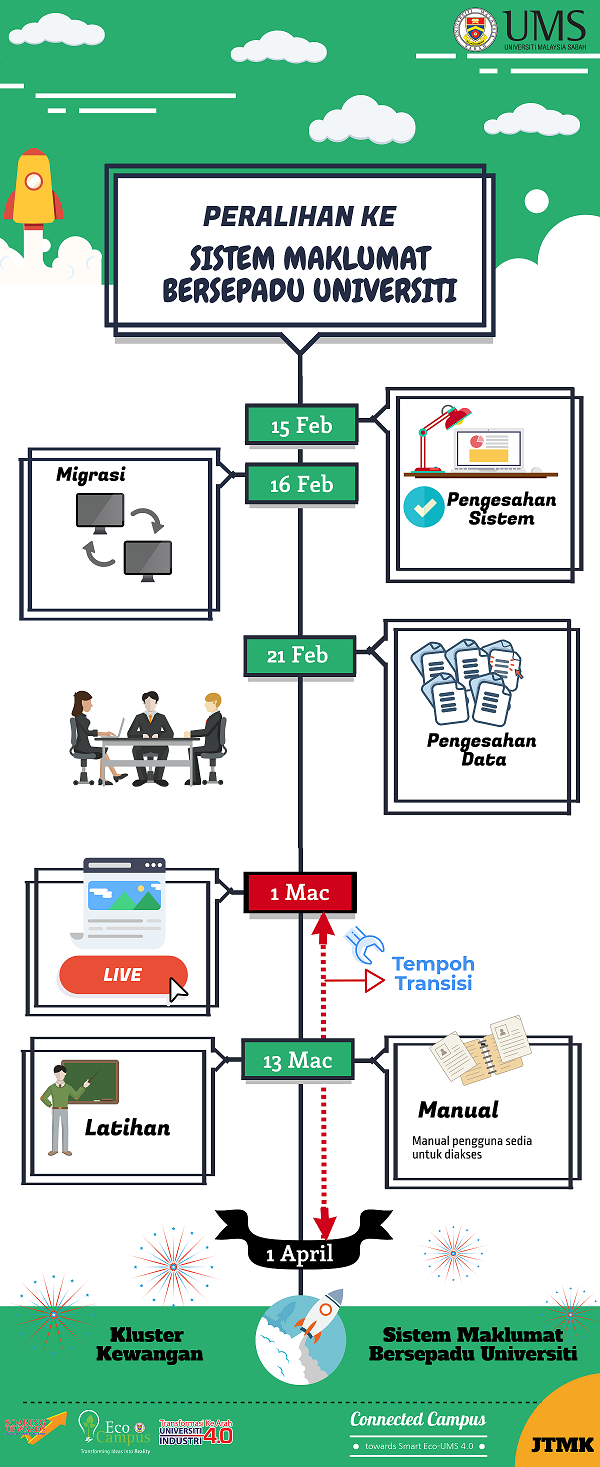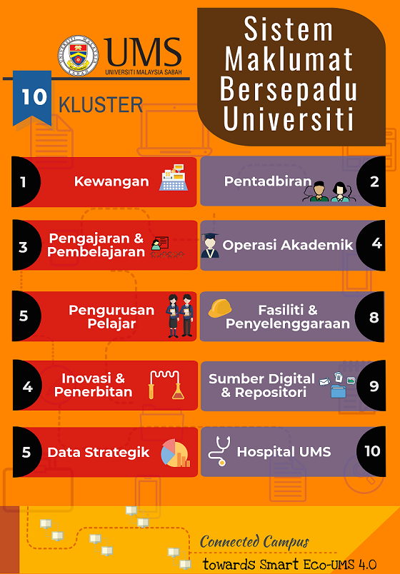 Sukacita dimaklumkan kepada seluruh warga Universiti Malaysia Sabah (UMS), selaras dengan transformasi ke arah Universiti Industri 4.0, maka UMS sedang membangunkan Sistem Maklumat Bersepadu Universiti (SMBU) yang merangkumi semua komponen pengurusan pentadbiran UMS. SMBU-Pentadbiran adalah merupakan salah satu kluster di dalam SMBU dan akan menggantikan Sistem HR-Online sedia ada di UMS. SMBU-Pentadbiran (Rekod Peribadi) dijangka akan mula digunapakai mulai 01 Mac 2018 yang merangkumi maklumat-maklumat berikut:-