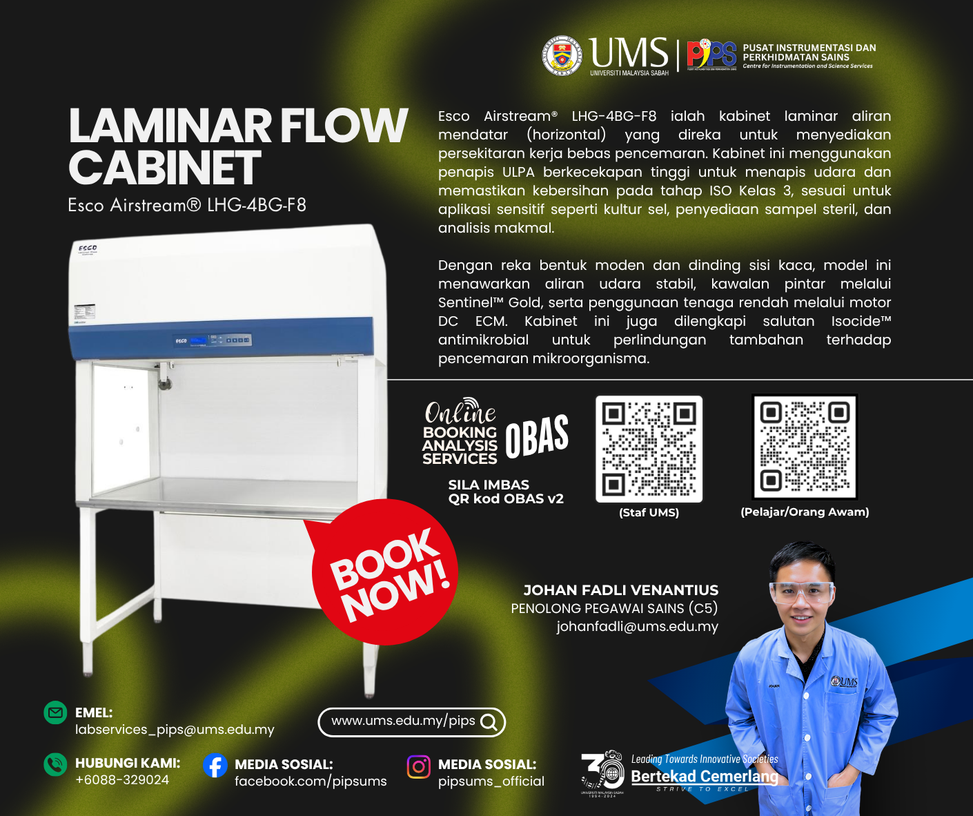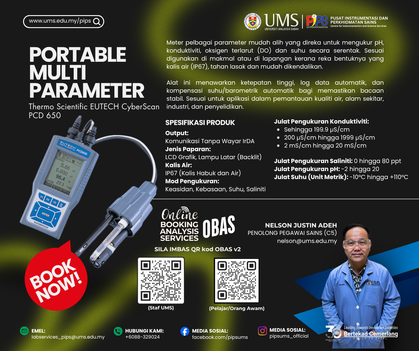 Sukacita dimaklumkan bahawa poster hebahan berkaitan perkhidmatan instrumen yang disediakan oleh Pusat Instrumentasi dan Perkhidmatan Sains (PIPS), Universiti Malaysia Sabah dilampirkan bersama untuk makluman dan rujukan YBhg. Prof./Prof. Madya Dr./Dr./Tuan/Puan.