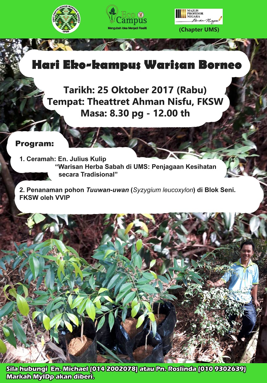 9.00 pagi | Ceramah oleh Encik Julius Kulip (Pensyarah Kanan IBTP dan Felo Penyelidik BoHRU): Warisan Herba Sabah di UMS: Penjagaan Kesihatan secara Tradisional |
