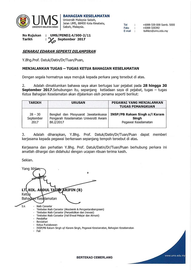SUBJEK: PEMANGKUAN TUGAS-TUGAS KETUA BAHAGIAN KESELAMATAN