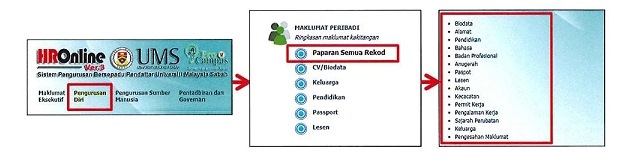 2. Sehubungan itu, semua kakitangan Universiti Malaysia Sabah (UMS) dikehendaki untuk mengemaskini MAKLUMAT PERIBADI di dalam sitem HROnline selewat-lewatnya pada 21 Ogos 2017 (Isnin). Sila rujuk panduan di bawah untuk langkah pengemaskinian: