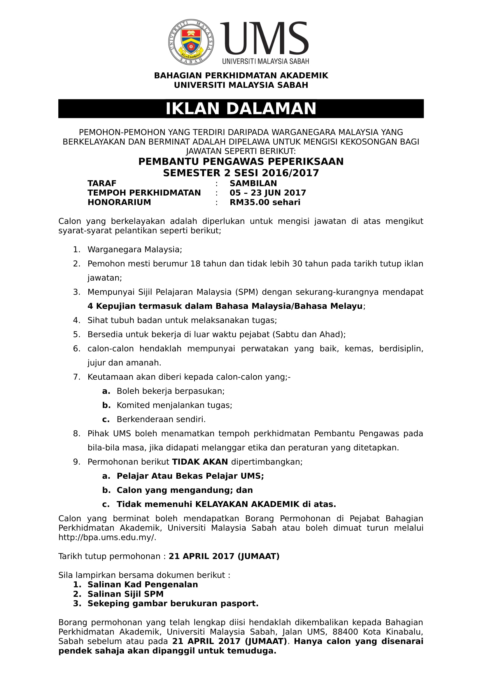 Subjek | : Iklan Dalaman Pengambilan Pembantu Pengawas Peperiksaan |