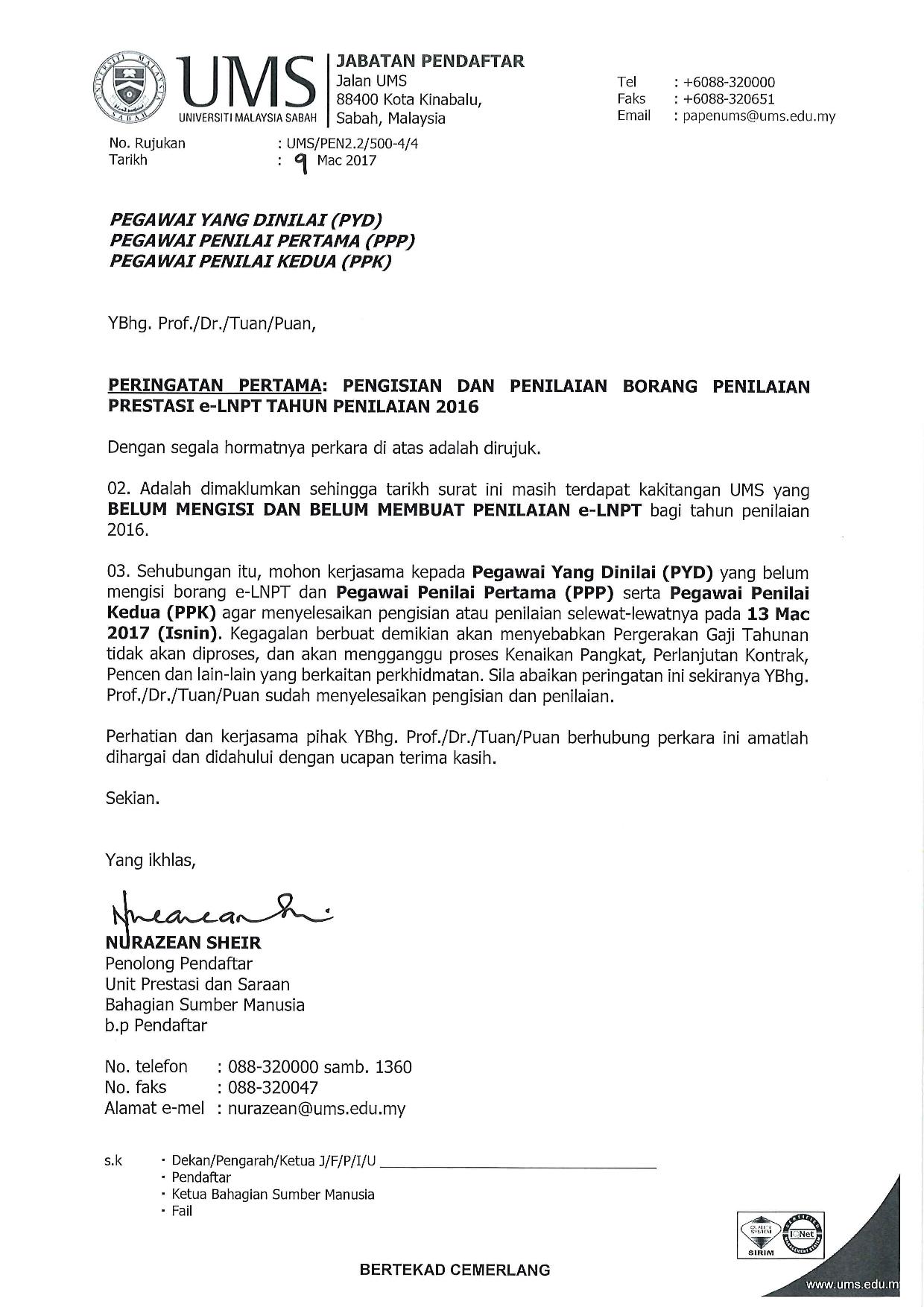 Subjek | : PERINGATAN PERTAMA: Pengisian Dan Penilaian Borang Penilaian Prestasi E-LNPT Tahun Penilaian 2016 |