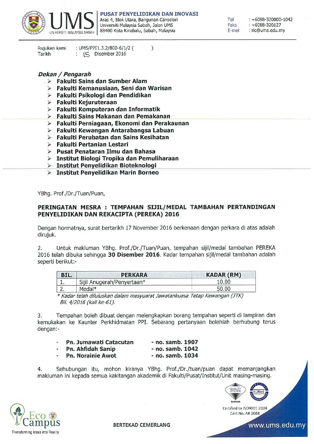 15 Dis 2016 - 16 Jan 2017 | Permohonan secara online melalui sistem MyGRANTS | Sistem akan dibuka sehingga jam 23:59 (16 Jan 2017; Isnin) | Pemohon |