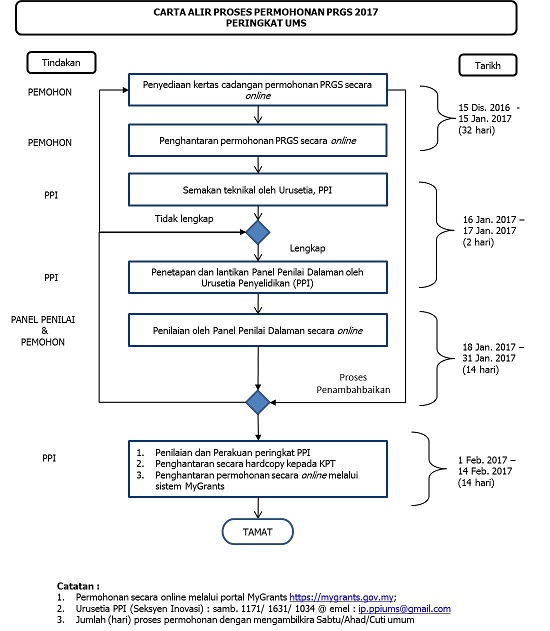 23 Jan 2017 - 15 Feb 2017 | Penilaian secara online oleh Panel Penilai Dalaman UMS Penilaian kali pertama Penambahbaikan kertas cadangan secara online Penilaian kali kedua | Proses penilaian boleh dilakukan lebih dari 2 kali tertakluk kepada penambahbaikan yang dibuat oleh pemohon Sistem akan dibuka sehingga jam 23:59 (15 Feb 2017; Rabu) | Urusetia PPI Panel Penilai, Pemohon |