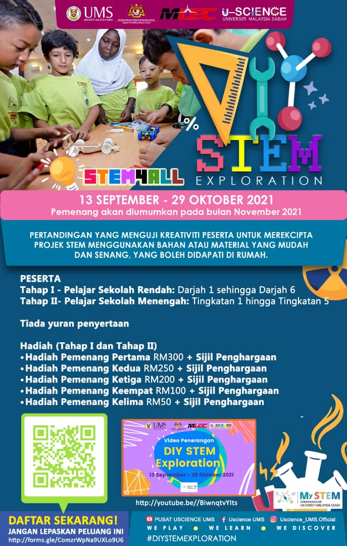 RABU, 6 OKTOBER - U-Science Universiti Malaysia Sabah (UMS) dengan kolaborasi Jabatan Pendidikan Negeri Sabah dan Malaysia Digital Economy Corporation (MDEC) mempelawa pelajar-pelajar sekolah rendah dan menengah di seluruh Sabah untuk menyertai program STEM4ALL: D.I.Y. STEM Exploration bertemakan Sains, Teknologi, Kejuruteraan dan Matematik (STEM).