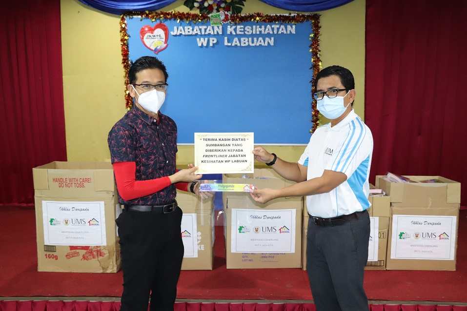 Timbalan Pendaftar Kanan UMSKAL, Zamri Haji Mohammad Tuah yang mewakili Pengarah UMSKAL, Professor Dr Jualang Azlan Gansau menyerahkan sumbangan tersebut kepada Pengarah Jabatan Kesihatan Labuan, Dr Ismuni Bohari.