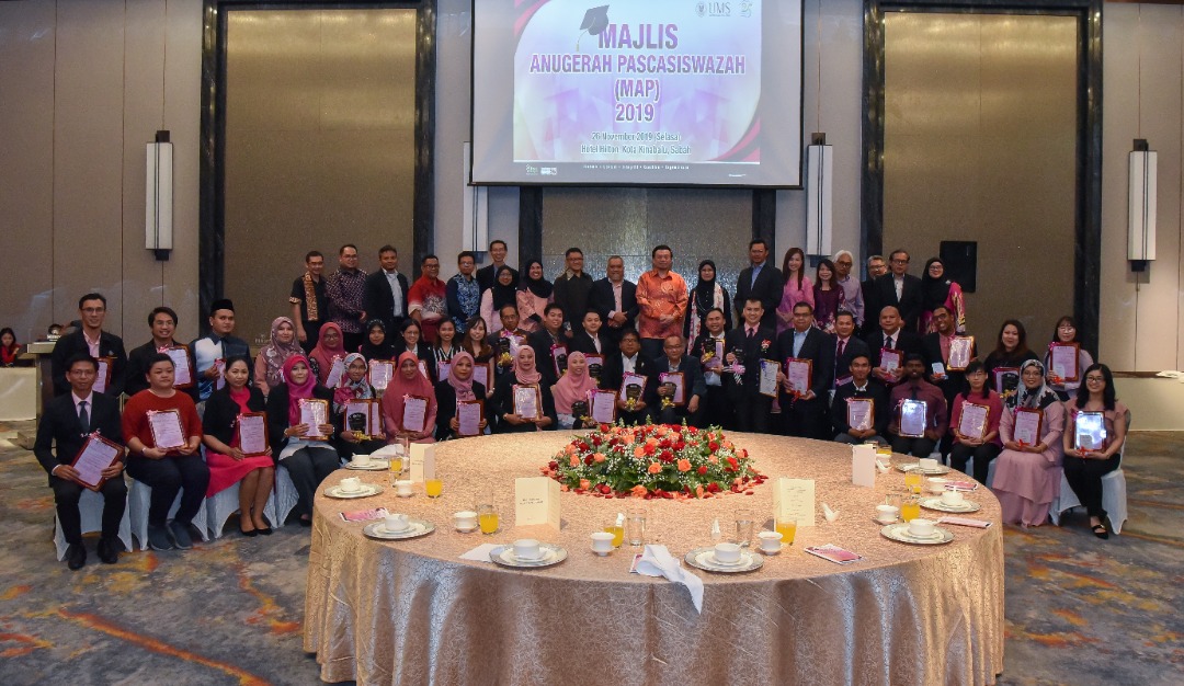 RABU, 27 NOVEMBER - Seramai 30 pelajar cemerlang pascasiswazah Universiti Malaysia Sabah (UMS) diraikan pada Majlis Anugerah Pascasiswazah (MAP) 2019 yang dirasmikan oleh Naib Canselor Profesor Datuk ChM. Dr. Taufiq Yap Yun Hin bertempat di Hotel Hilton, baru-baru ini.