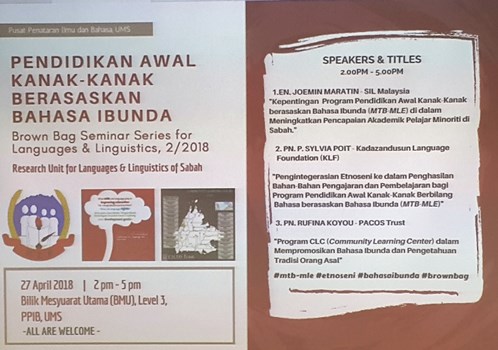 The announcement by the Minister of Education, Dr. Maszlee Malik, that he plans to focus on “increasing the number of students with multi-language skills” (NST, 22/05/2018[2]) could not have come at a more positive time. The Research Unit for Languages & Linguistics of Sabah (RULLS) at Universiti Malaysia Sabah is delighted to be on the same wavelength as the Minister of Education. The Research Unit for Languages & Linguistics of Sabah (RULLS) successfully held its second Brown Bag Seminar Series for Languages & Linguistics on 27 April 2018 with the theme Pendidikan Awal Kanak-Kanak berasaskan Bahasa Ibunda (Mother Tongue-based Early Childhood Education) at Bilik Mesyuarat Utama, Pusat Penataran Ilmu dan Bahasa, Universiti Malaysia Sabah. Following the success of the previous Brown Bag seminar with two speakers, the third seminar featured three speakers who are each very experienced in early childhood education in the mother tongue. The three speakers, Mr. Joemin Maratin (SIL Malaysia), Mdm. P. Sylvia Poit (Kadazandusun Language Foundation), and Mdm. Rufina Koyou (PACOS Trust) took turn speaking to a packed audience of 116 people mainly from the public. The audience was welcomed by the Dean for the Centre for the Promotion of Knowledge and Language, AP. Dr. Jualang Azlan Gansau.