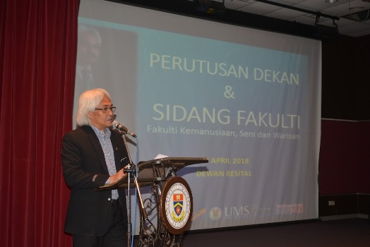 KHAMIS, 26 APRIL – Majlis Perutusan Dekan dan Sidang Fakulti 2018 Fakulti Kemanusiaan, Seni dan Warisan (FKSW), Universiti Malaysia Sabah (UMS) berlangsung dengan jayanya di Theatrette Ahmad Nisfu FKSW baru-baru ini.