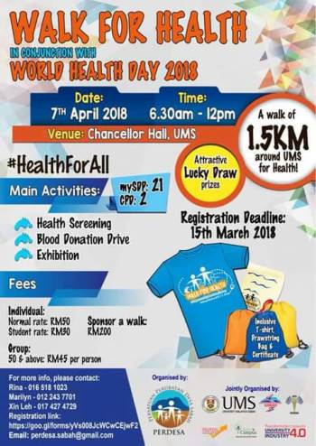RABU, 28 MAC - Orang ramai dipelawa untuk menyertai program Walk for Health 2018 anjuran Fakulti Perubatan dan Sains Kesihatan (FPSK) Universiti Malaysia Sabah (UMS) yang akan berlangsung pada 7 April depan.