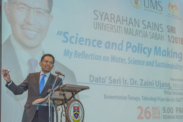 Beliau berkata demikian ketika menyampaikan syarahan bertajuk “Science and Policy Making: My Reflection on Water, Science and Sustainability” di hadapan lebih 400 warga UMS yang hadir.