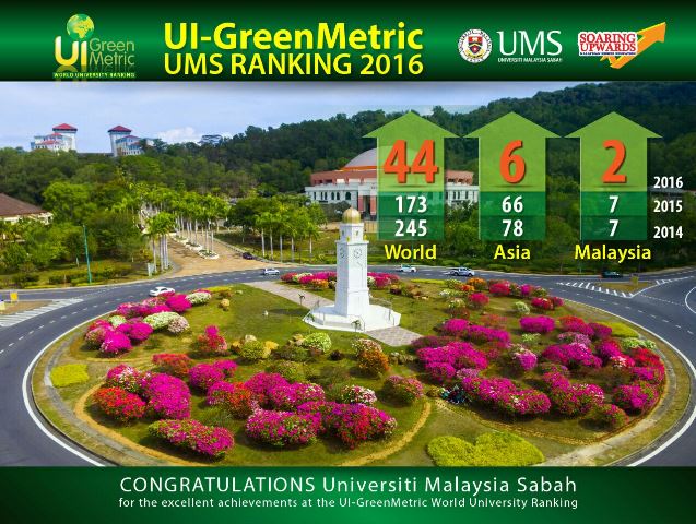 JUMAAT, 30 DISEMBER - Universiti Malaysia Sabah (UMS) menutup lembaran tahun 2016 dengan pencapaian cemerlang, apabila berjaya meraih kedudukan ke-44 terbaik dunia dalam UI-GreenMetric World University Ranking 2016 menurut senarai kedudukan yang diterbitkan kelmarin. (29 Disember 2016).
