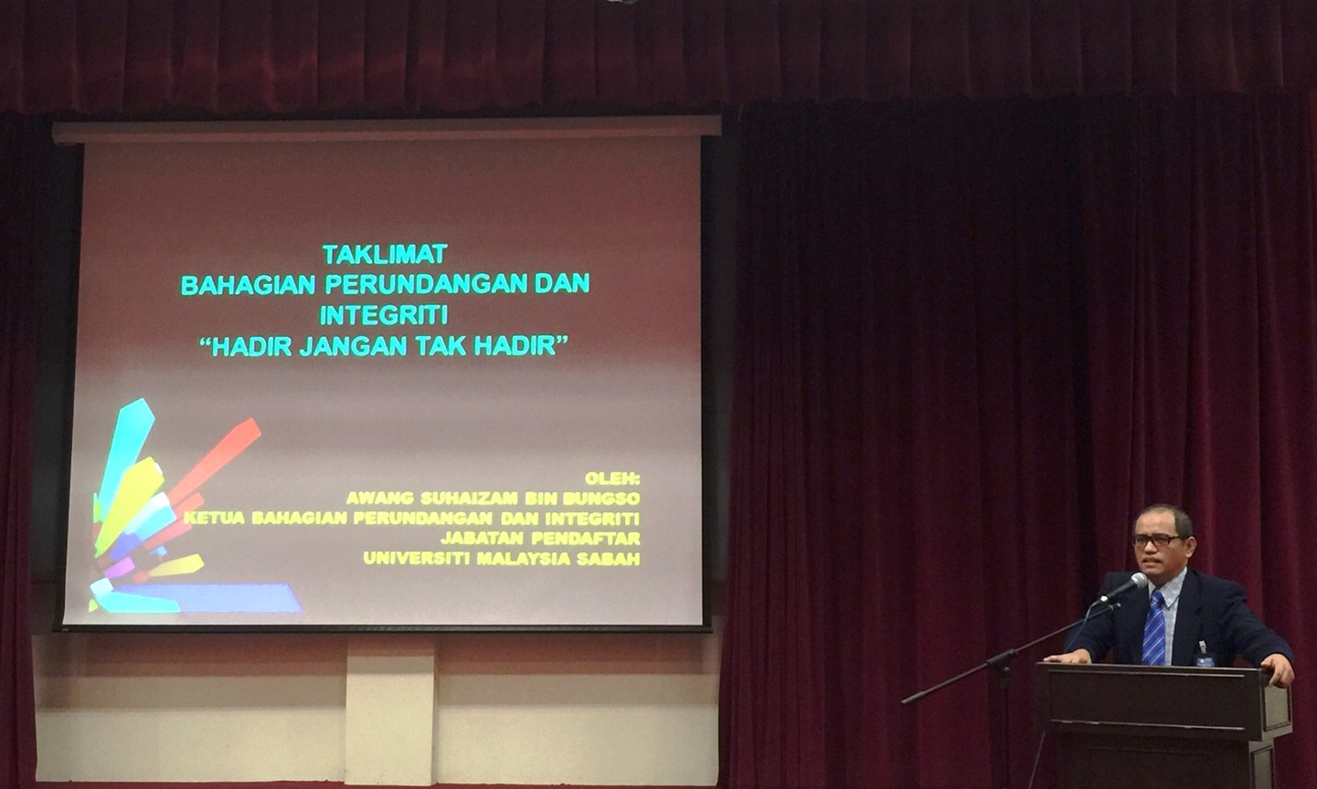 Taklimat bertajuk ‘Hadir Jangan Tak Hadir’ itu disampaikan Ketua Bahagian Perundangan dan Integriti jabatan berkenaan, Awang Suhaizam Bungso.