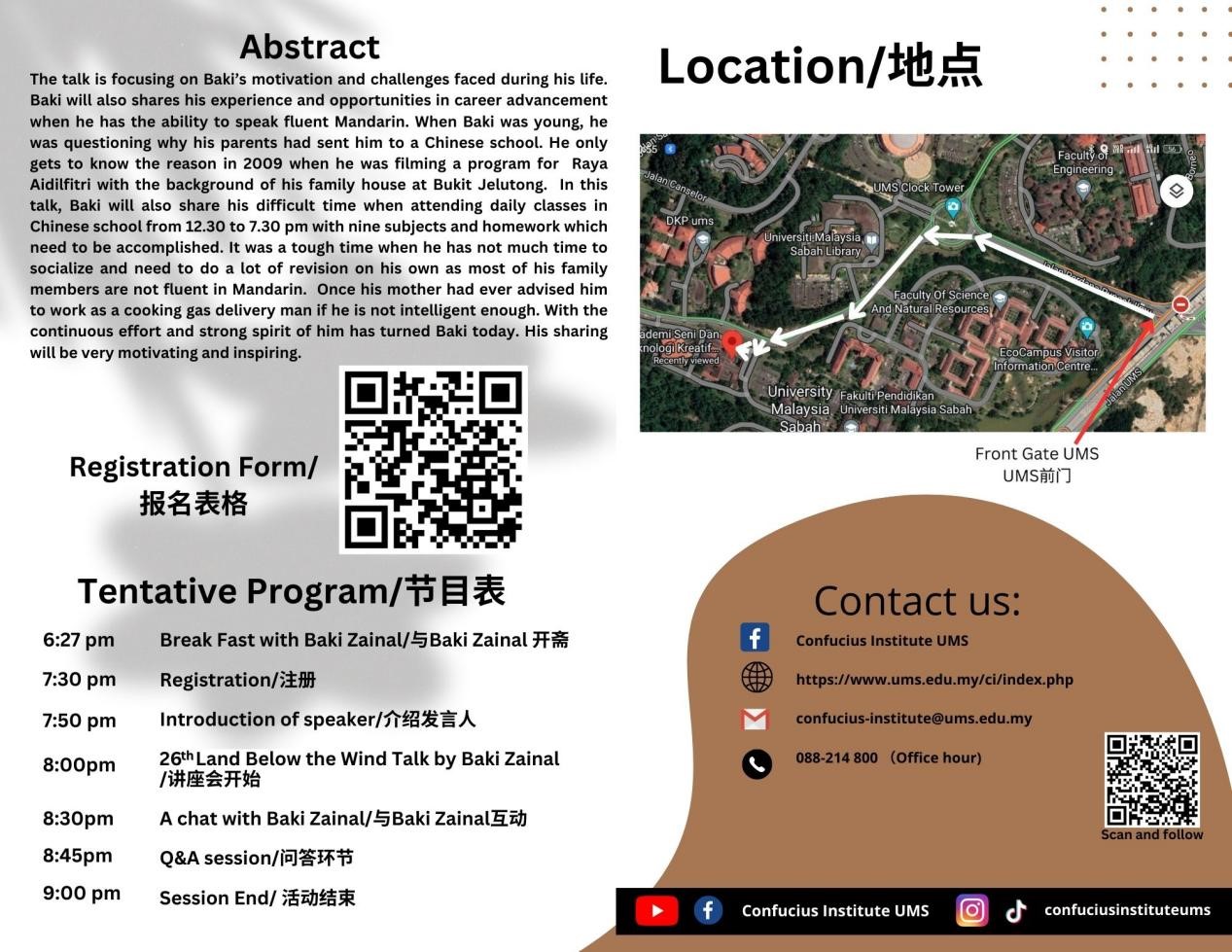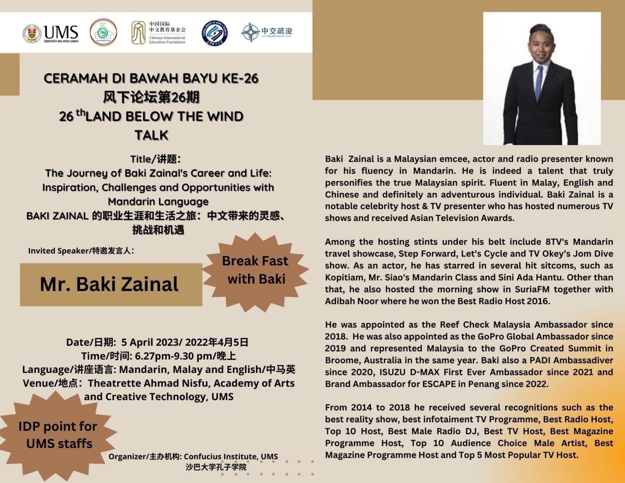 Siri Ceramah di Bawah Bayu kali ke-26 anjuran Institut Confucius Universiti Malaysia Sabah (CI@UMS) akan mengetengahkan topik “Perjalanan Kerjaya dan Kehidupan Baki Zainal: Inspirasi, Cabaran dan Peluang dengan Bahasa Mandarin”.
