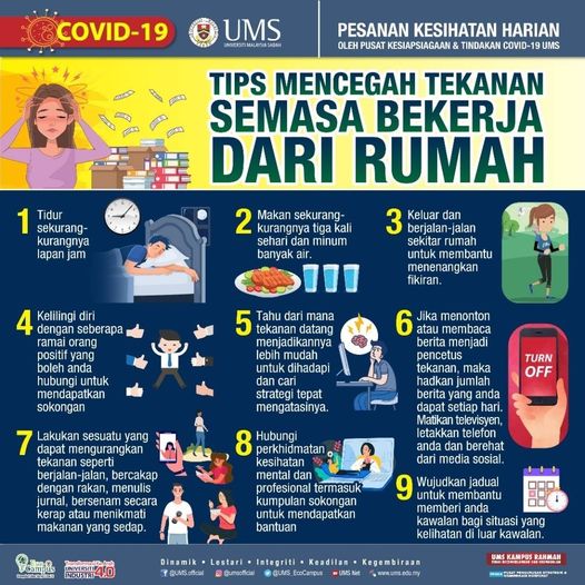9 Disember 2020 - " Tips Menjaga Mencegah Tekanan Semasa Bekerja Dari Rumah " Pesanan Kesihatan Harian Oleh Pusat Kesiapsiagaan Dan Tindakan Covid-19 UMS