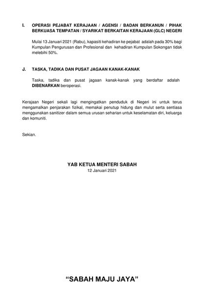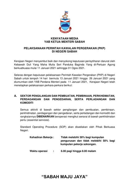 12 Januari 2021 - Kenyataan Media YAB Ketua Menteri Sabah " Pelaksanaan Perintah Kawalan Pergerakan (PKP) Di Negeri Sabah