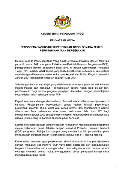 12 Januari 2021 - Kenyataan Media Kementerian Pengajian Tinggi Pengoperasian Institusi Pendidikan Tinggi Semasa Tempoh Perintah Kawalan Pergerakan