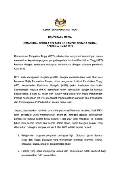 1 Februari 2021 - Kenyataan Media Kementerian Pengajian Tinggi " Kemasukan Semula Pelajar Ke Kampus Secara Fizikal Bermula 1 Mac 2021