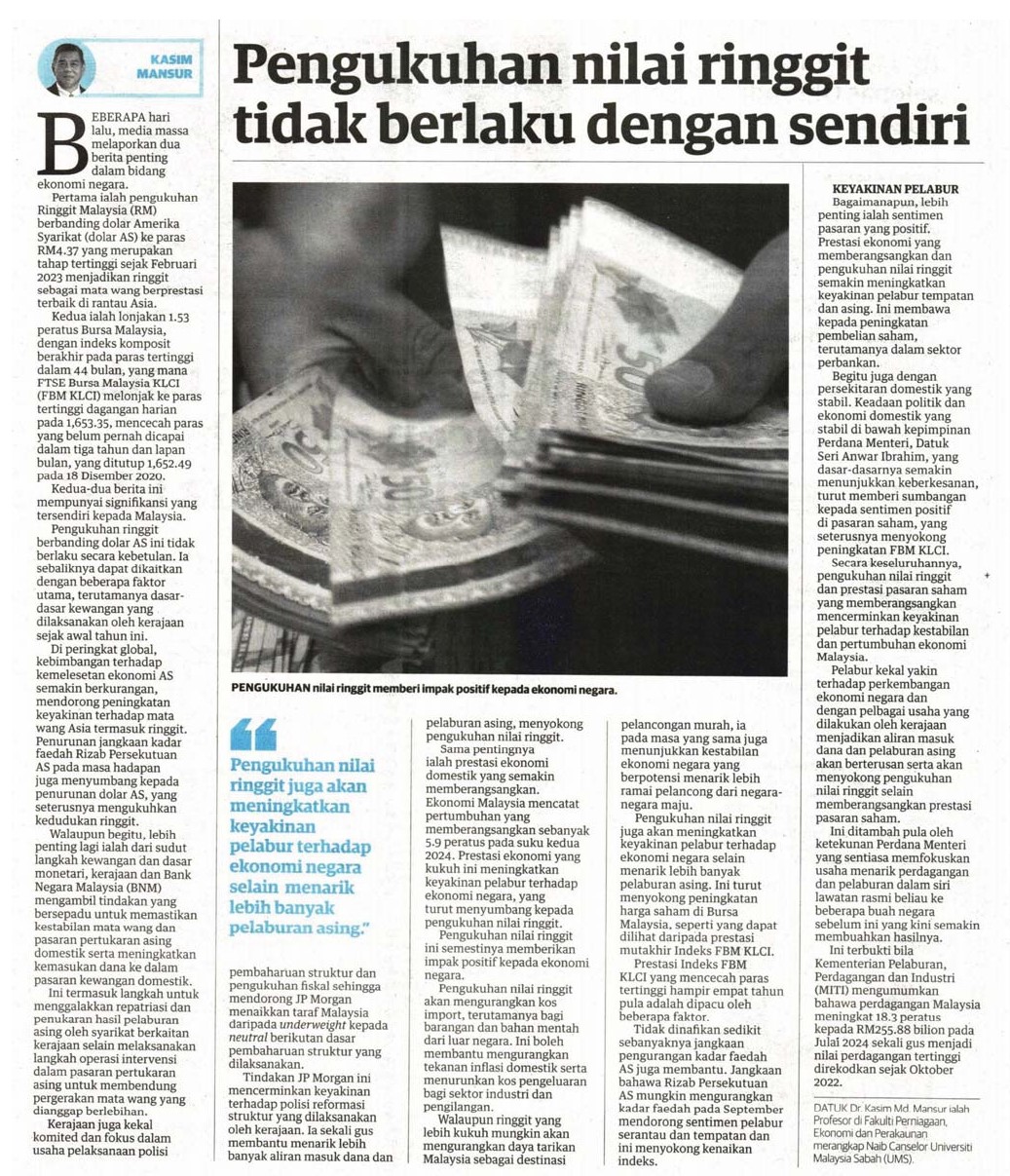Pengukuhan nilai ringgit juga akan meningkatkan keyakinan pelabur terhadap ekonomi negara selain menarik lebih banyak pelaburan asing. Ini turut menyokong peningkatan harga saham di Bursa Malaysia, seperti yang dapat dilihat daripada prestasi mutakhir Indeks FBM KLCI.