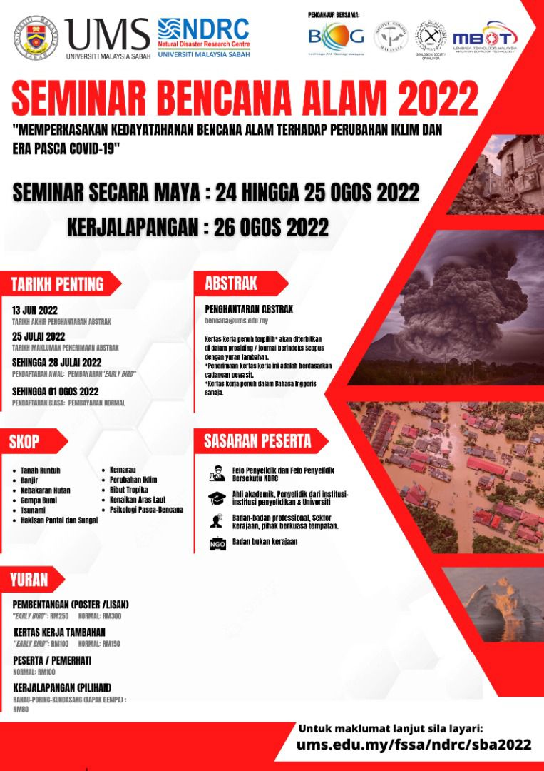 Pusat Kajian Bencana Alam (Natural Disaster Research Centre, NDRC), Fakulti Sains dan Sumber Alam, Universiti Malaysia Sabah dengan kerjasama Lembaga Geologi Malaysia (BOG), Institut Geologi Malaysia (IGM), Persatuan Geologi Malaysia dan Lembaga Teknologi Malaysia (MBOT) ingin menjemput kakitangan akademik/penyelidik/pelajar pascasiswazah yang berminat untuk menghantar abstrak kertas kerja bersempena Seminar Bencana Alam 2022 (SBA 2022) yang akan dijalankan secara maya mengikut ketetapan berikut;