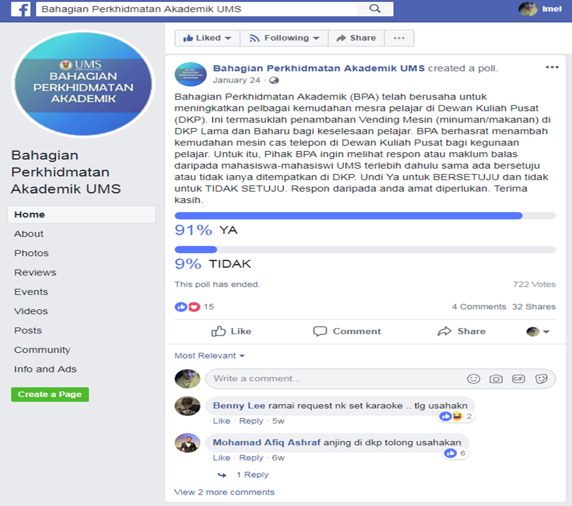 14 Mac 2019 Jumlah paparan: 9653 Keputusan E-Participation Di Laman Sosial Bahagian Perkhidmatan Akademik UMS Cetak Emel
